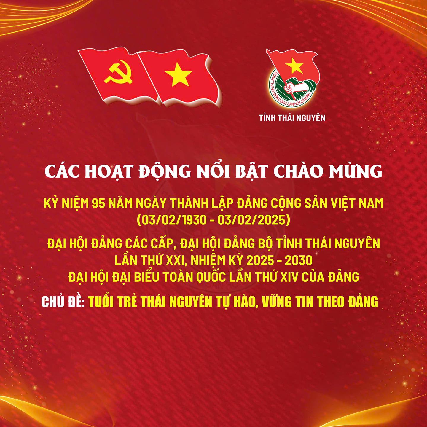 Hòa chung không khí thi đua sôi nổi lập thành tích chào mừng kỷ niệm 95 năm Ngày thành lập Đảng Cộng sản Việt Nam (03/02/1930 - 03/02/2025); Đại hội Đảng bộ các cấp, Đại hội đại biểu Đảng bộ tỉnh Thái Nguyên lần thứ XXI, nhiệm kỳ 2025 - 2030, Đại hội đại biểu toàn quốc lần thứ XIV của Đảng, Tuổi trẻ tỉnh Thái Nguyên đã phát động và triển khai chuỗi các hoạt động sôi nổi, mang đậm dấu ấn xung kích, sáng tạo và trách nhiệm.