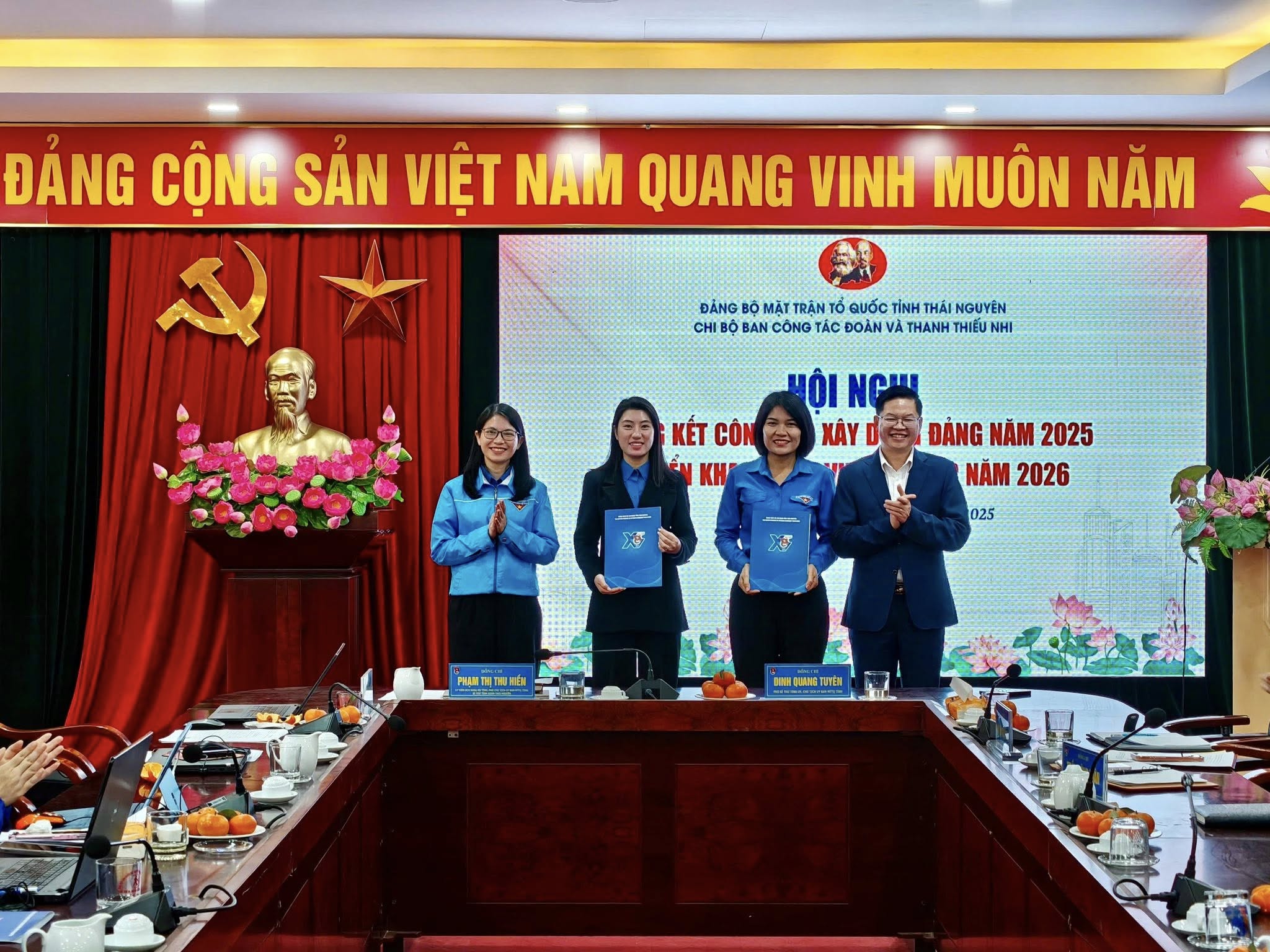 Sáng 22/12/2025, Chi bộ Ban Công tác Đoàn và Thanh thiếu nhi tổ chức Hội nghị Tổng kết công tác xây dựng Đảng năm 2025, triển khai nhiệm vụ công tác năm 2026. Dự và chỉ đạo Hội nghị có đồng chí Đinh Quang Tuyên, Phó Bí thư Tỉnh uỷ, Bí thư Đảng uỷ Mặt trận Tổ quốc, Chủ tịch Uỷ ban Mặt trận Tổ quốc Việt Nam tỉnh Thái Nguyên; đồng chí Phạm Thị Thu Hiền, Ủy viên Ban Chấp hành Đảng bộ tỉnh, Phó Chủ tịch Uỷ ban Mặt trận Tổ quốc Việt Nam tỉnh, Bí thư Tỉnh đoàn, Bí thư Chi bộ Ban Công tác Đoàn và Thanh thiếu nhi và các đồng chí đảng viên trong Chi bộ.